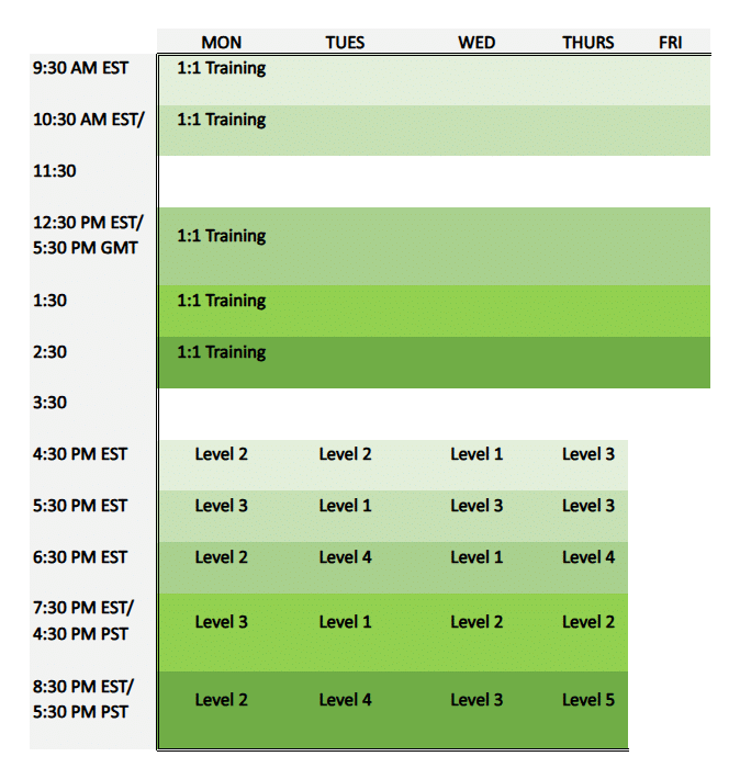 The times below are approximate. Whenever possible, we keep students in the same time slot when they progress to the next level. Get in touch to find out exact class times.